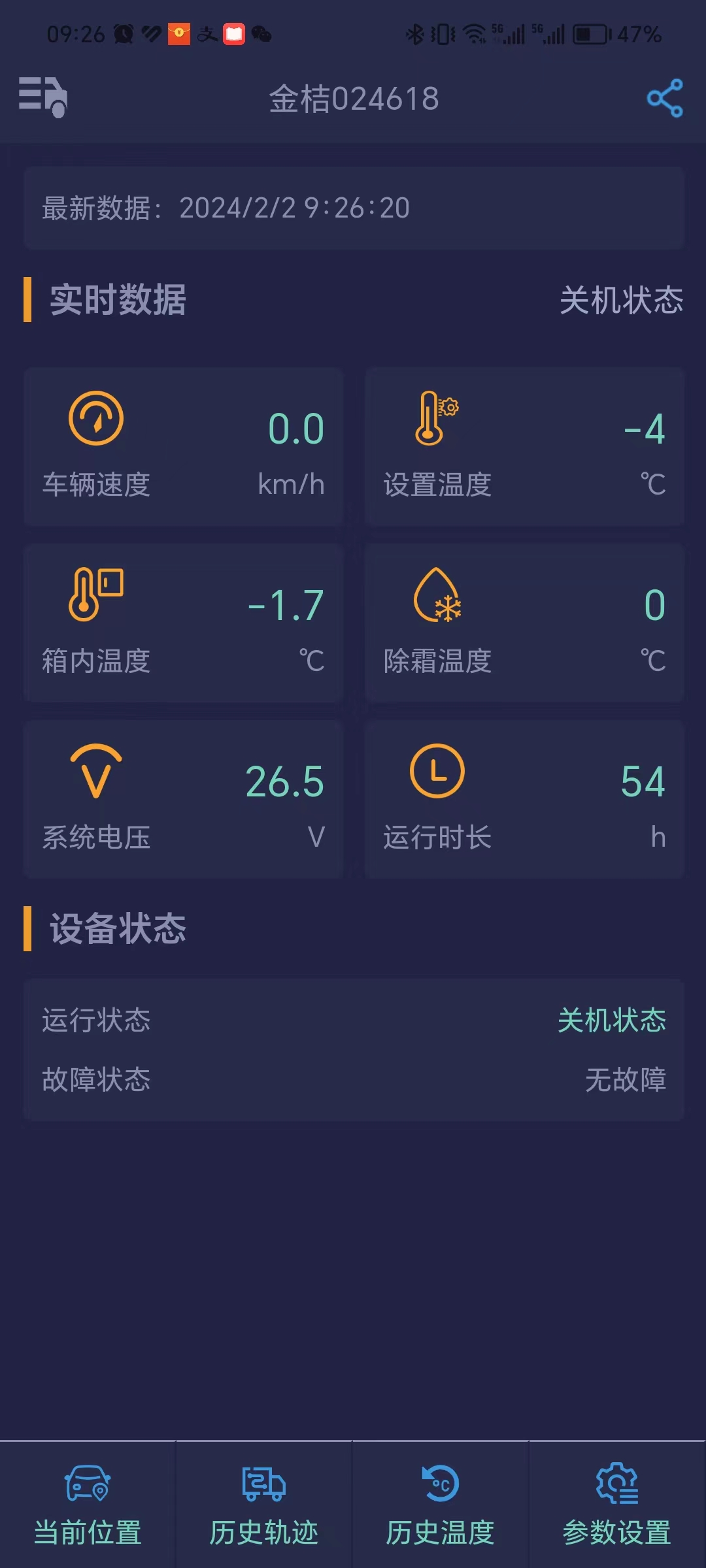 【實時數(shù)據(jù)】:展示設(shè)備當前實時運行狀態(tài)、車廂制冷溫度、車輛定位、運行速度;